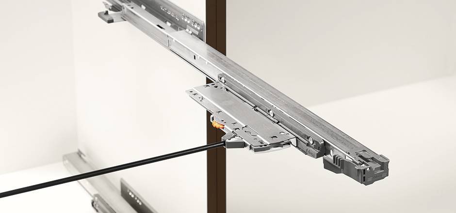 Для выдвижных ящиков австрийцы разработали специальные синхронизаторы движения. Они обеспечивают равномерное распределение нагрузки на противоположные стенки короба, если расстояние между ними превышает 60 см.