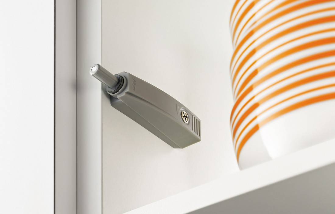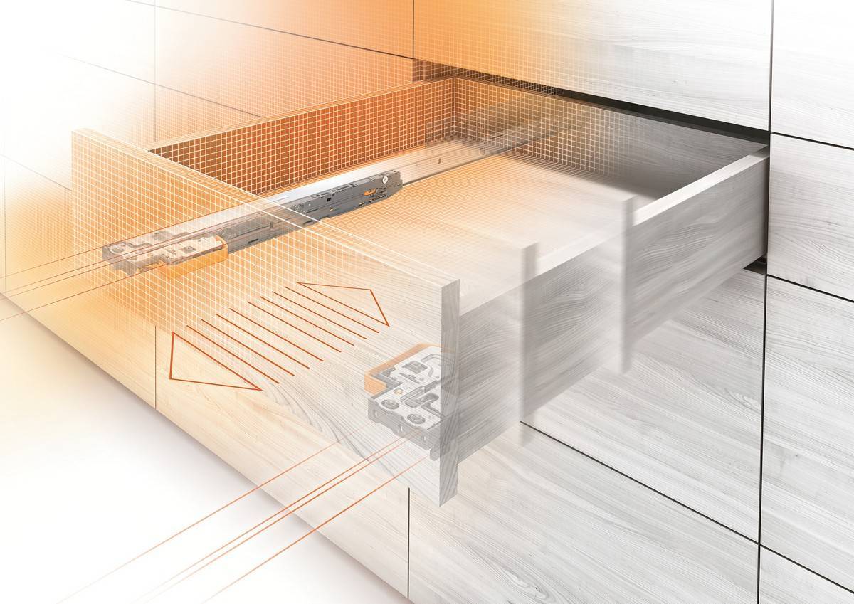 Те же Blum и Hettich предлагают такие системы встраивать прямо в направляющие выдвижных ящиков. Это так называемые адаптивные демпферы, обеспечивающие мебельным модулям плавный ход при любом приложенном усилии. На фасадах шкафчиков без ручек похожие конструкции интегрируются в навесы.