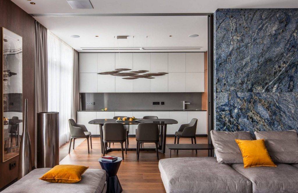 Чаще всего нейтральным тоном оформляют гостиную, делая акцент на одну из стен, размещая по периметру помещения картины, скульптуры или фотографии.