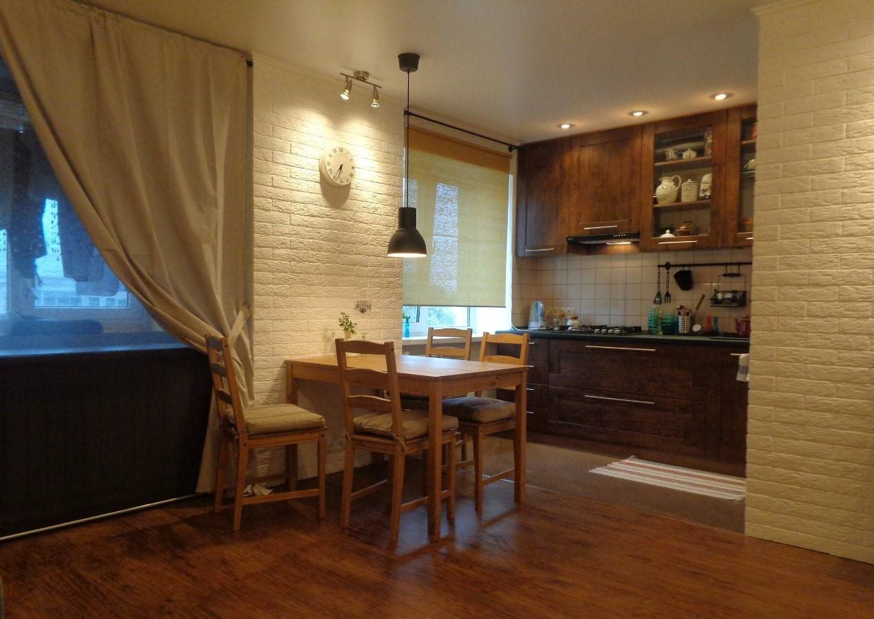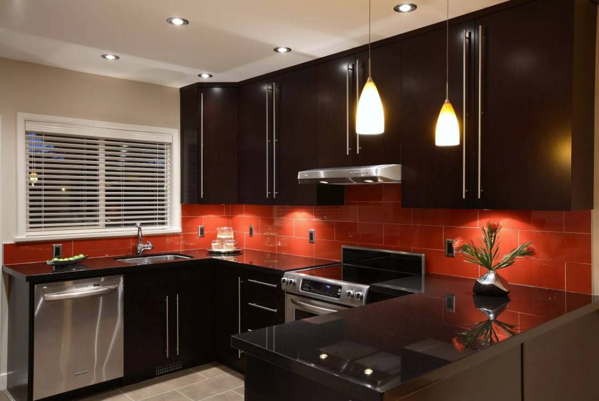 Это могут быть, например, коричневые обои на кухне или кухня с коричневой столешницей. Следует помнить, что слишком тёмные обои визуально уменьшают помещение.