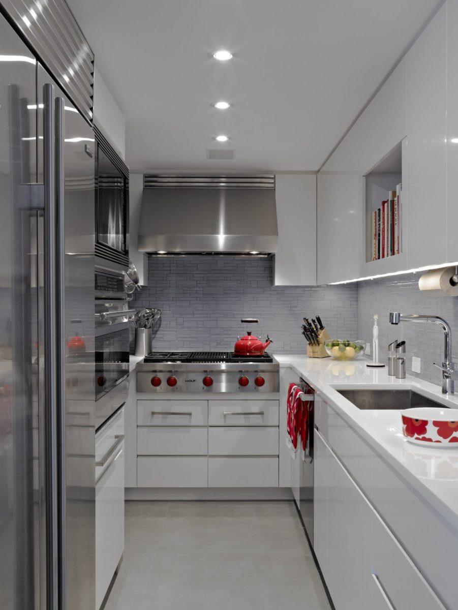 У противоположной стены устанавливают холодильник, стол, здесь же располагается плита, рабочая поверхность. Мойку или варочную панель можно разместить у короткой стены или в углу.