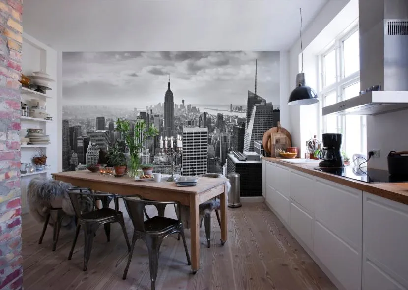 Данный стиль соединил в себе классику и минимализм и подразумевает применение ахроматических цветов (белого, черного, серого), иногда – цвета дерева. Наряду с очень простым и функциональным белым кухонным гарнитуром на кухне с таким дизайном присутствует современная техника. Закрытые непрозрачные фасады помогают поддерживать постоянную чистоту.