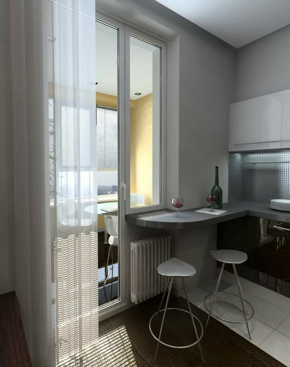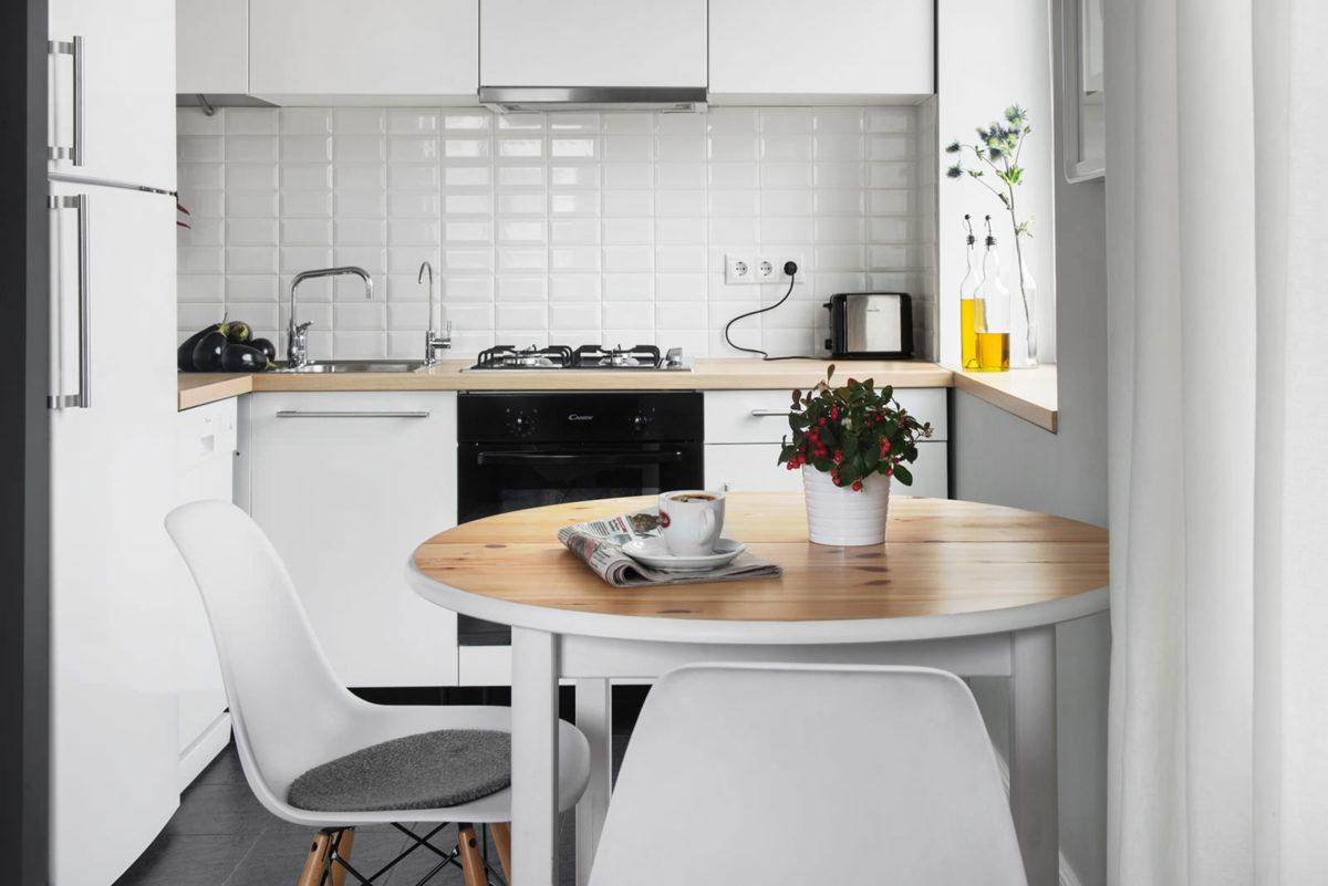 Если в квартире проживают 1-2 человека, стол можно заменить барной стойкой или обустроить под принятие пищи подоконник. Другие варианты – компактный круглый или раскладной стол.