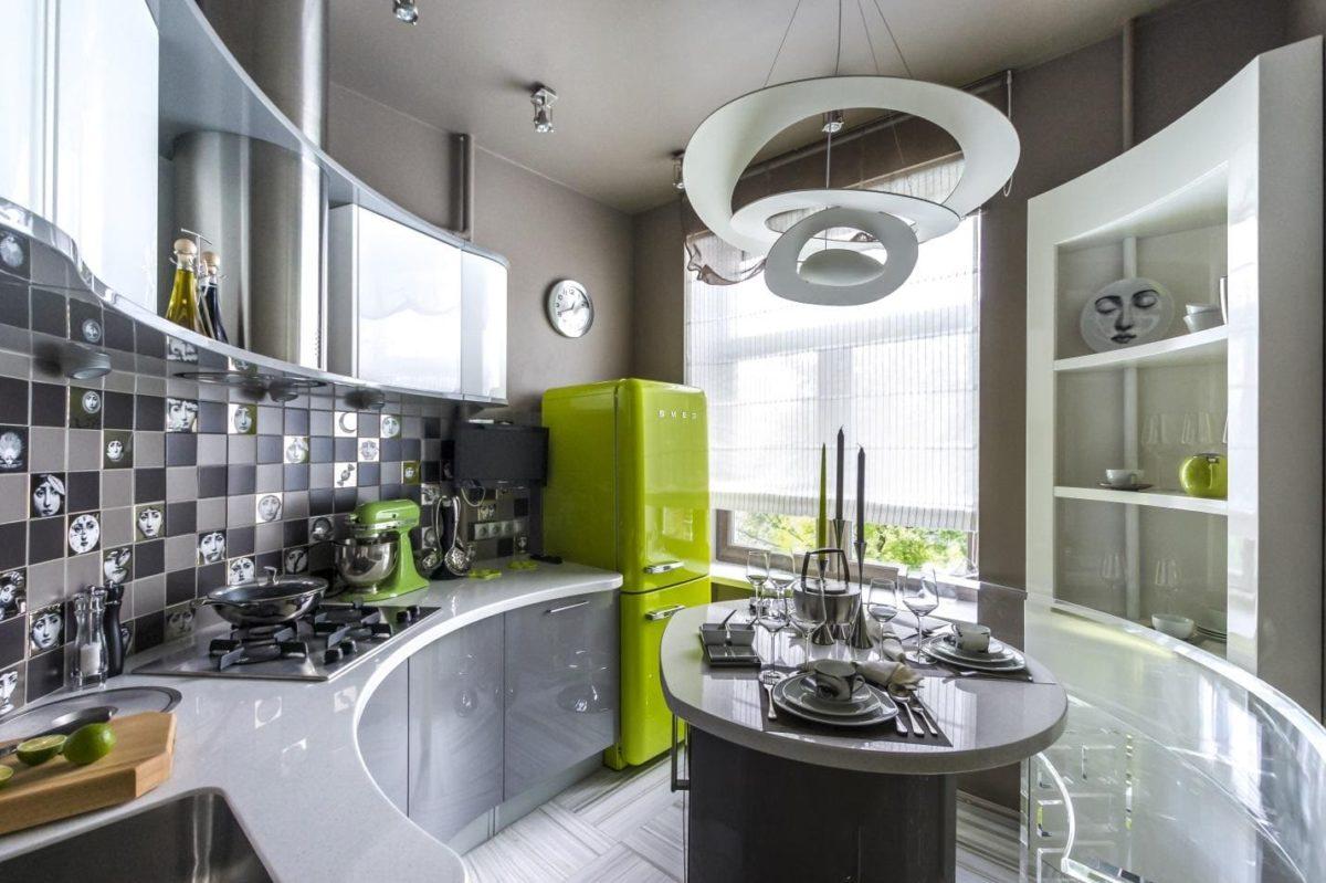 Такой строгий дизайн с футуристическим настроением и ровными глянцевыми поверхностями, отражающими свет, хорошо смотрится в малогабаритных помещениях. Форма гарнитура может быть как привычной угловатой, так и необычной (к примеру, угловой гарнитур со скруглёнными боковыми тумбами и очень лаконичной мойкой). В качестве основных цветов лучше выбирать белый, серый, металлик; уместны будут и вкрапления ярких тонов (например, шкафы с красными или салатовыми фасадами).