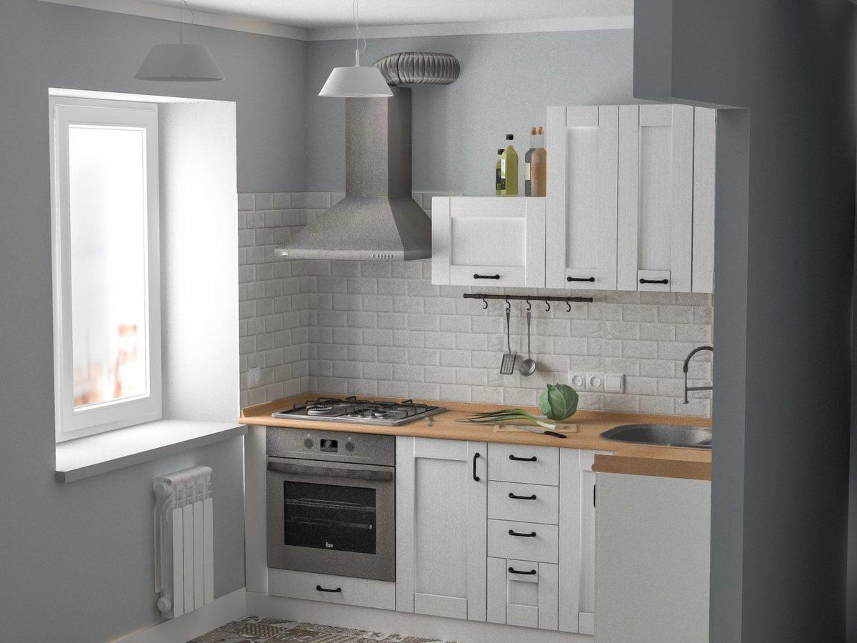 В малогабаритку органично впишется прямая конструкция. Благодаря расположению вдоль одной стены, получается значительно увеличить зону приготовления пищи. Лучше всего установить прямую модель возле самой длинной стенки. Придется совершить перенос коммуникаций, но зато удастся сохранить свободные квадратные метры.