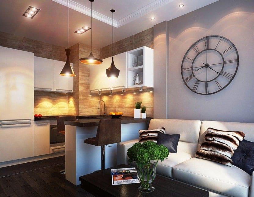 На следующих фото представлен интерьер кухни в однокомнатной хрущевке, которую увеличили за счет гостиной.