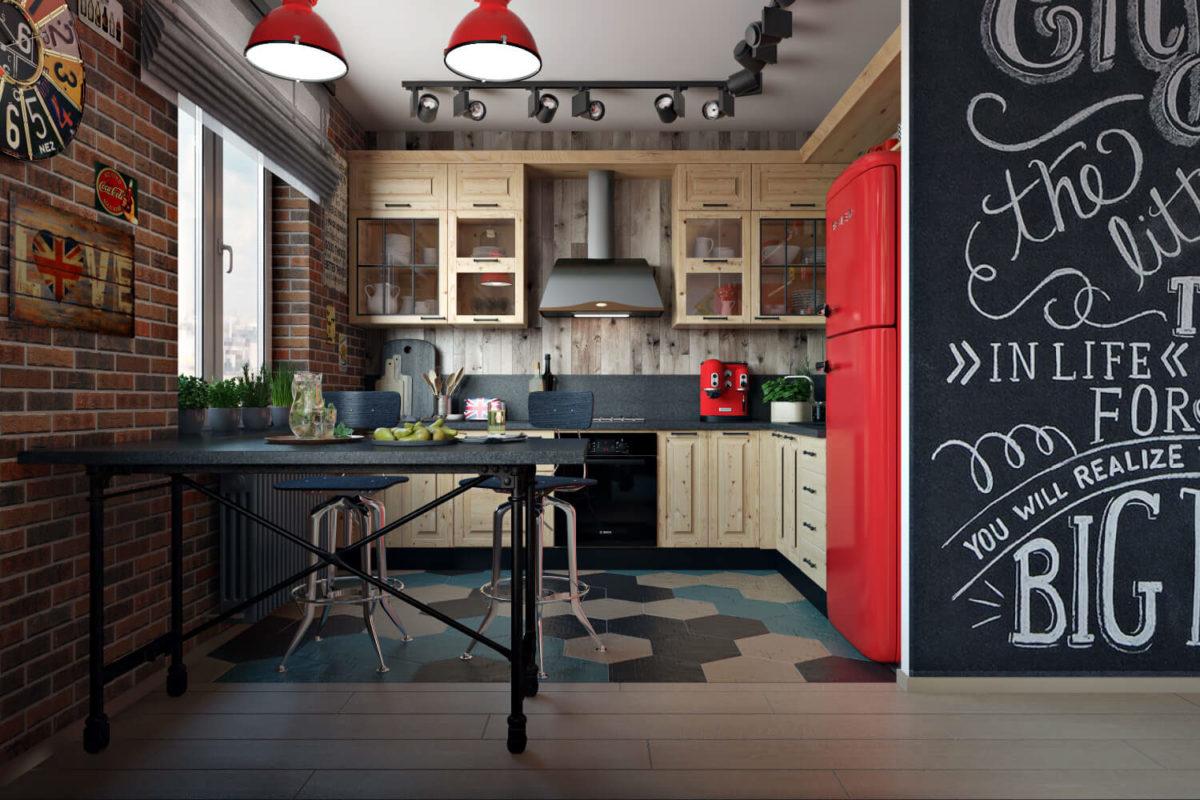 Чаще Лофт выбирают для крупных кухонь (в том числе совмещённых с гостиной), но его облегчённый вариант подойдёт и тесному помещению. Стены могут быть отделаны штукатуркой под бетон или стилистически нейтральным покрытием типа светлой моющейся краски.