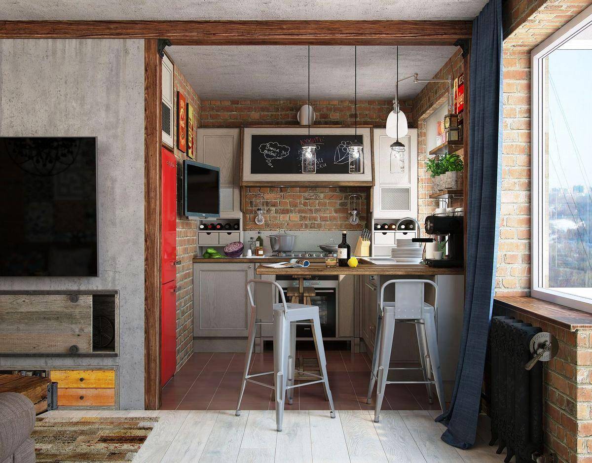 Кухни-гостиные сейчас пользуются популярностью: они подойдут семьям, регулярно принимающими гостей. Интерьер такого помещения может быть выполнен в стиле лофт: достаточное пространство позволяет использовать его особенности (фактурные поверхности, тёмные тона) в полной мере. Кухню нужно оборудовать мощной вытяжной системой, чтобы запахи не досаждали гостям.