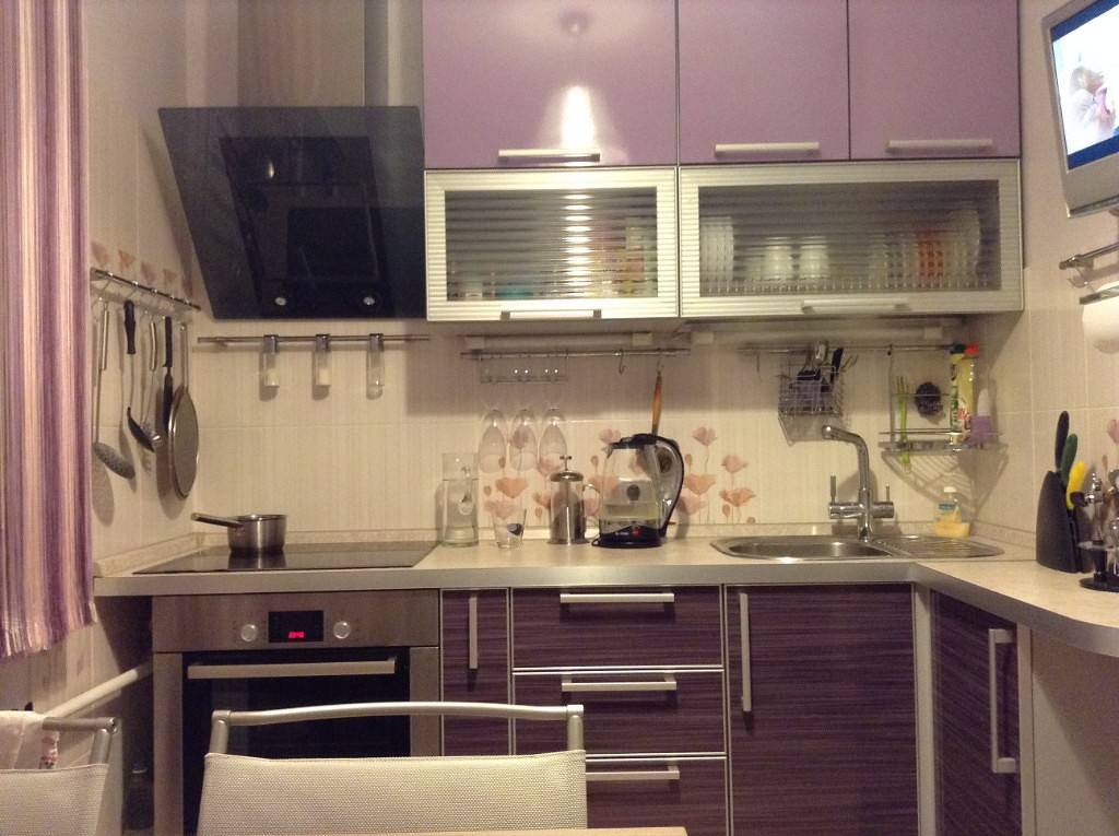 При такой планировке предпочтительнее повесить шторы с крупным рисунком. Следует продумать дополнительное освещение. Обычно оно устанавливается на фартук. Двери выбираются раздвижного типа, чтобы сэкономить место.