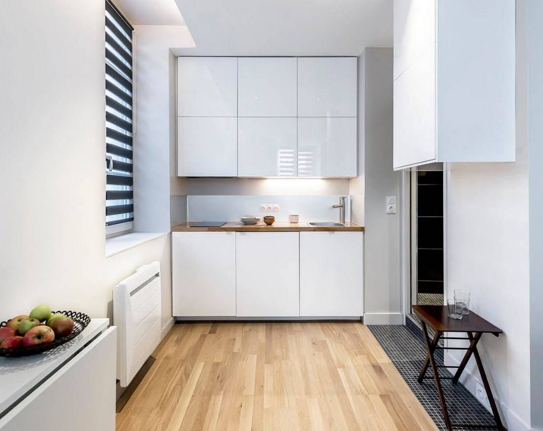 Подобное интерьерное решение, выглядит очень необычно, значительно экономит площадь и зрительно увеличивает ее. В прямоугольной или квадратной нише без окна, часто устанавливают более компактные кухонные гарнитуры или конструкции п-образной формы.