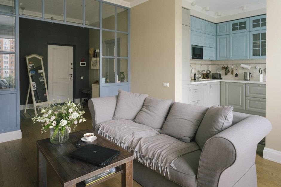 Всего одна стеклянная перегородка обеспечит проникновение света из смежной комнаты и при этом создаст ощущение изоляции. Тем более, что ее можно оснастить шторкой, которая при необходимости будет отделять кухню полностью. Это решение особенно актуально для проходной кухни или кухни-ниши, обустроенной в холле или в гостиной как показано на фото ниже (листайте фото вправо).