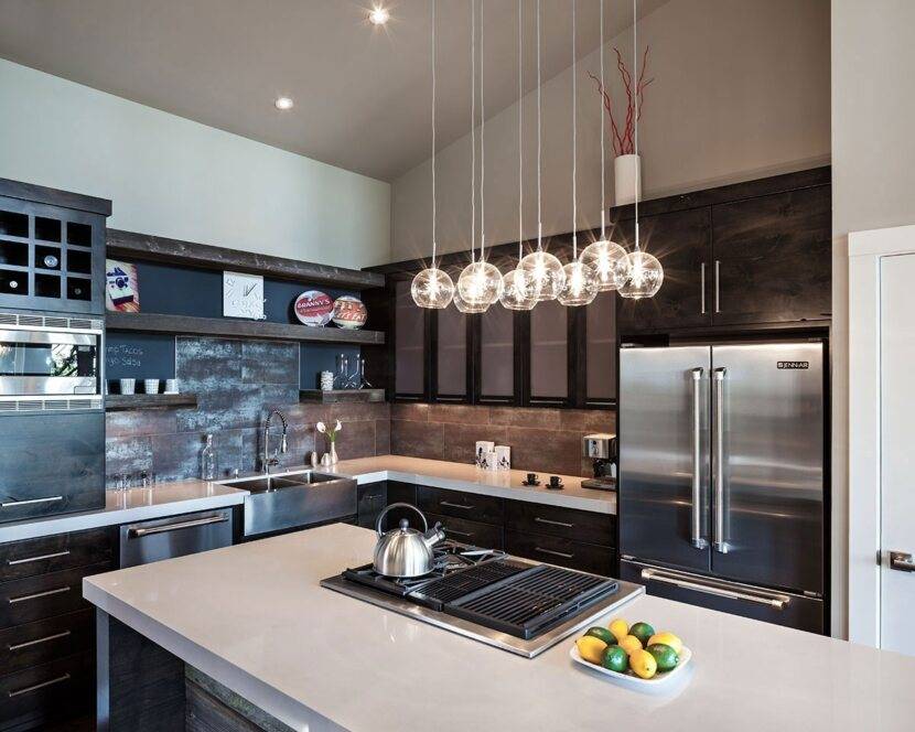 В маленькой кухне лучше отказаться от подвесных светильников и больших люстр и сделать равномерное точечное освещение в подвесном или натяжном потолке. Чем больше светильников, тем лучше.