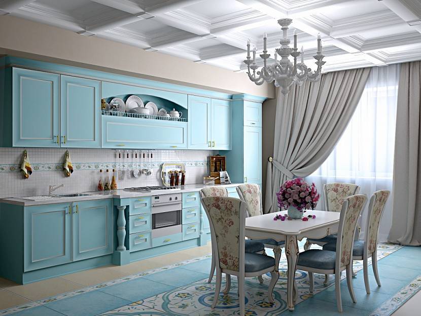 - если на кухне большие окна — это несомненный плюс для прованса, который любит много света. Лампы и светильники не будут лишними.