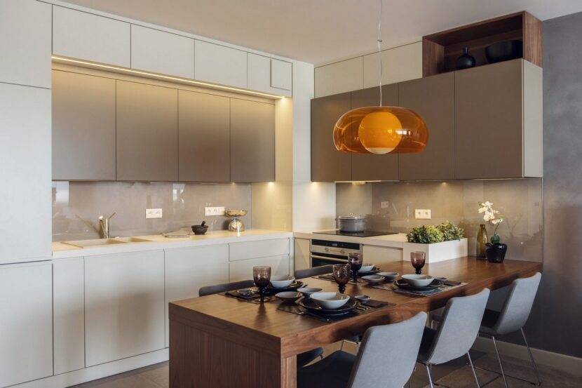 Правильная современная светлая кухня с солидным пространством потребует хорошо распланированных разграничений рабочей зоны и местом для приема пищи
