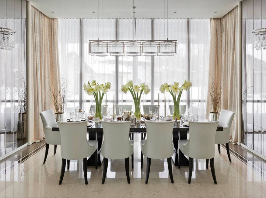 При обустройстве столовой зоны важно уделить внимание оформлению окна (выбору штор и системе освещения). В качестве штор используют легкие полотна, которые можно собрать подвязками или римские шторы