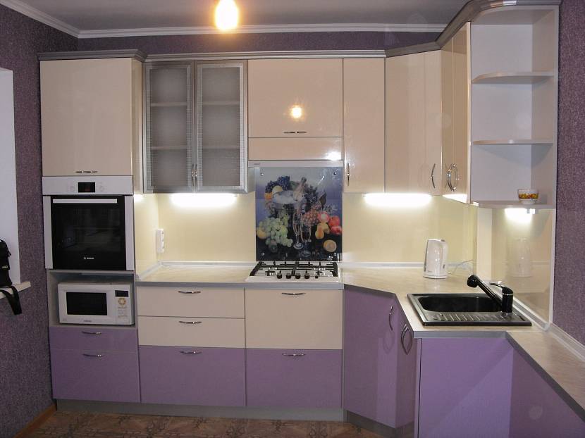 Фартук. Светло-фиолетовые кухонные фасады отлично выглядят с фартуком из стекла с изображением цветов или фруктов. Также хорошо выглядят фартуки из керамической плитки или мозаики светлых тонов.