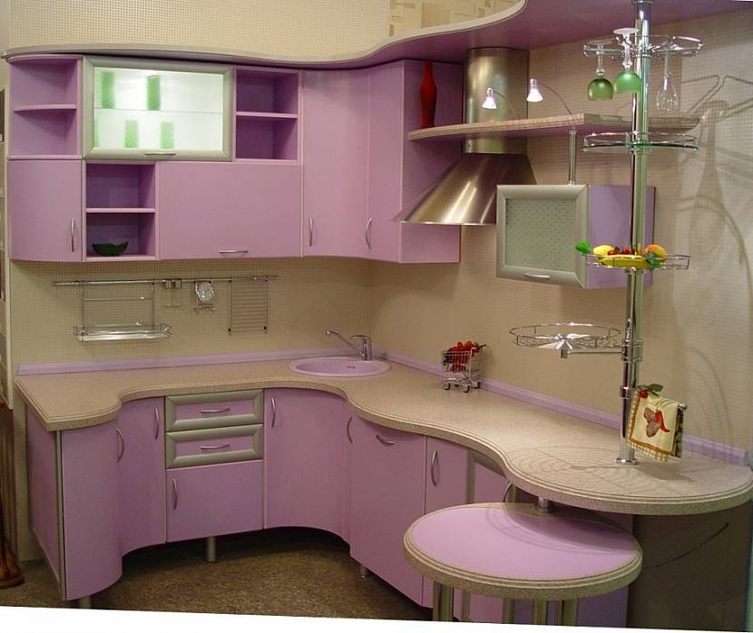Маленькие кухни имеют очень ценное качество: все, кто здесь находится, буквально близки друг другу. Мягкая фиолетовая гамма поможет взаимопониманию, успокоит конфликт, расположит к душевному общению.