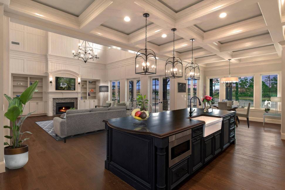 Классика — это вариант для большой комнаты, который оценят семьи с большим количеством домочадцев. Допускается использовать только натуральные материалы, ведь подделку классика не терпит. Позолота, резная мебель, картины — все это будет актуально для классической кухни-гостиной.