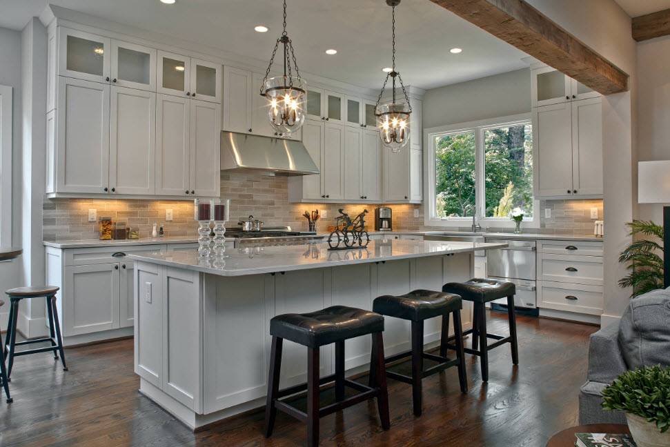Это самое распространенное решение, требующее, как правило, минимального вложения средств и сил. Чем больше площадь помещения, тем больше делается обеденная группа. Появляется возможность установки масштабного кухонного гарнитура, включающего в себя, помимо обеденного стола и стульев, барную стойку и кухонный остров.
