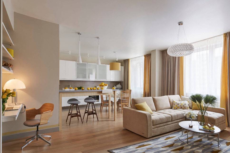 Создать общее пространство, в котором могла бы поместиться кухня и гостиная, сложно. Удастся добиться гармонии только в одном случае: в плане оформления должна прослеживаться общность. Сделать это можно при помощи единой цветовой гаммы, общих элементов декора, общего напольного покрытия. Обозначать и подчеркивать функциональность отдельных зон позволят приемы, описанные в данной статье.