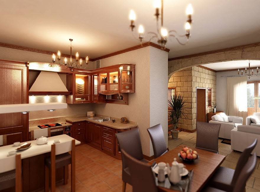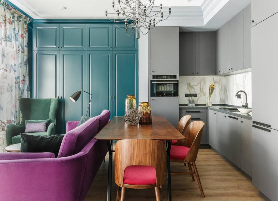 Вариантов совмещения достаточно: кухня-столовая, кухня-гостиная, кухня-гостиная-столовая