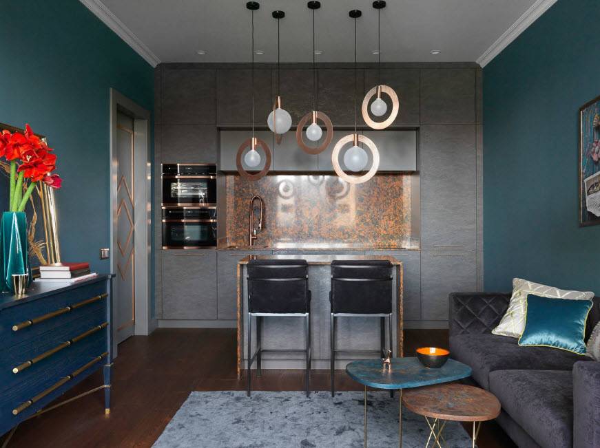 Множество людей выбирают для кухни-гостиной модерн. Он будет хорошо смотреться на любой площади, независимо от того, большая она или маленькая. Можно воспользоваться поверхностями из стекла, барными стульями, креслами, которые обладают необычными формами.