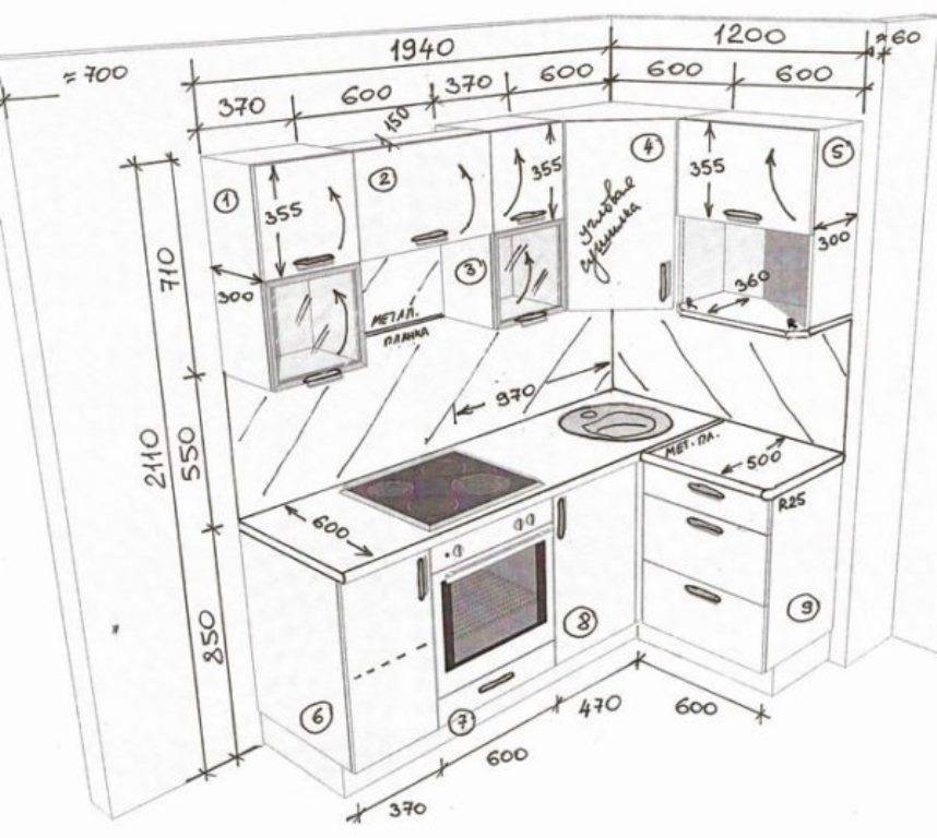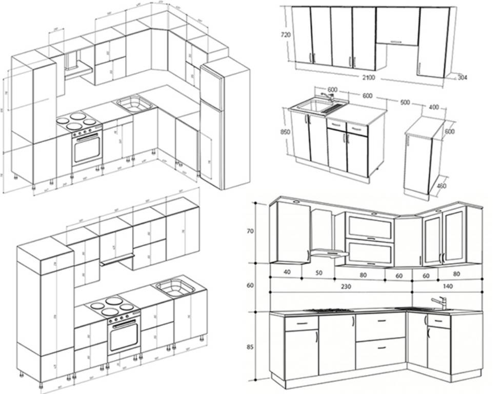 Угловая кухня проектируется с учетом тех же особенностей. Для подвесных шкафов нужно определить удобную высоту расположения. Можно использовать для изготовления кухни своими руками чертежи и схемы на фото: