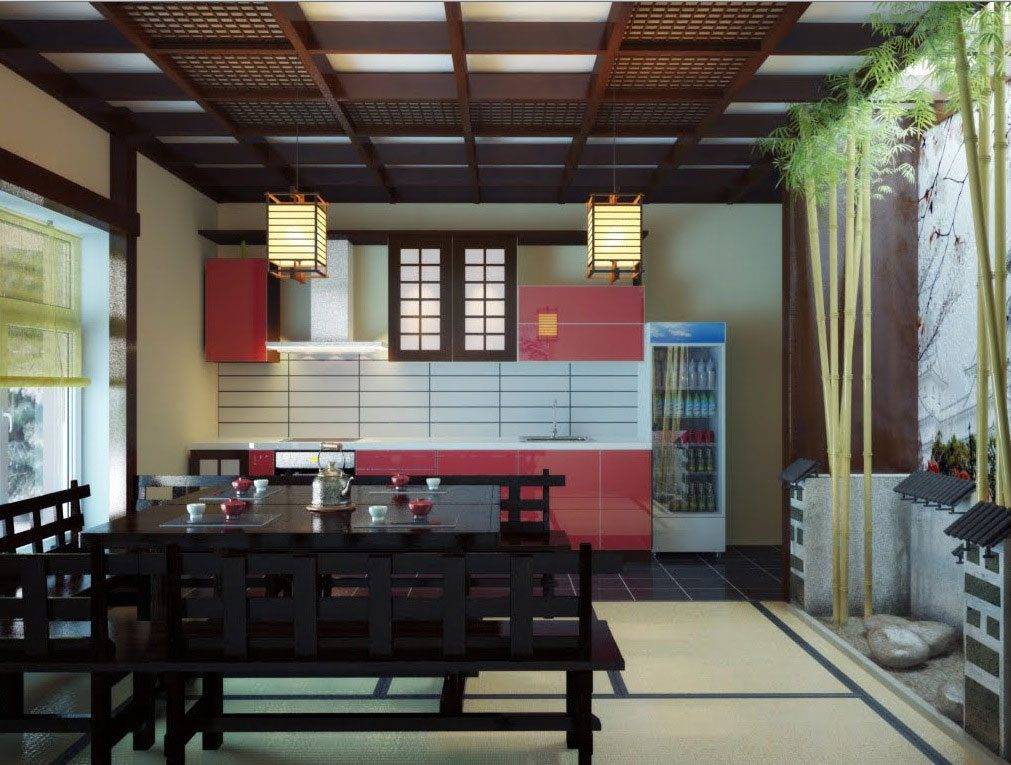 Практичность японского стиля в интерьере позволяет обустроить функциональную и стильную кухню. Сюда отлично подойдет приземистая мебель, натуральный текстиль, ролеты на окнах, циновки на полах. Посуда должна быть вся убрана в шкафчики. Главное не забывать, что японский стиль потребует небольшого количества навесных шкафов, столов, классических стульев. Минимализм поможет сохранить свободное пространство.