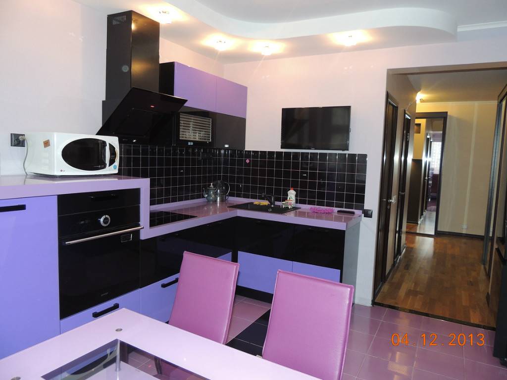 Для слабонасыщенного фиолетового дополнительная цветовая гамма для кухни — это желтый. Чтобы комбинация не выглядела слишком контрастно, стоит отдавать предпочтение светлым, сливочным оттенкам.