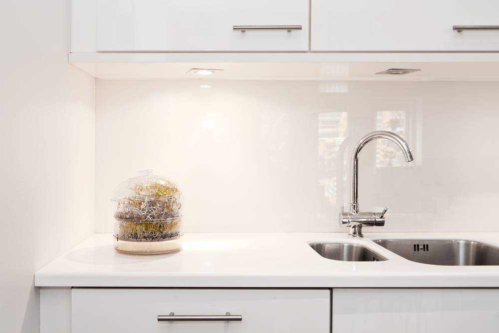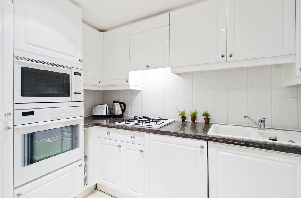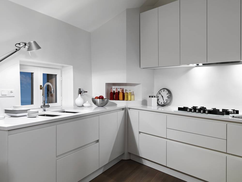 Грязь и пятна на белой поверхности легко замечаемы, поэтому можно быстро убрать беспорядок и защитить кухню от микробов и бактерий. Белые шкафы добавляют ощущение чистоты помещения.