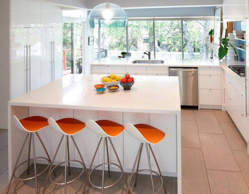 Остров в кухонном гарнитуре – это многофункциональный стол, который располагается в центре помещения и позволяет удобно передвигаться в рабочем пространстве между плитой, мойкой и холодильником. Кухни с островом уместны в просторных помещениях, где можно легко подойти к столу с любой стороны. Некоторые модели оснащаются передвижным островом. Для владельцев белых глянцевых кухонь рекомендуется использовать контрастные оттенки столешницы острова для того, чтобы разбавить однотонность гарнитура.