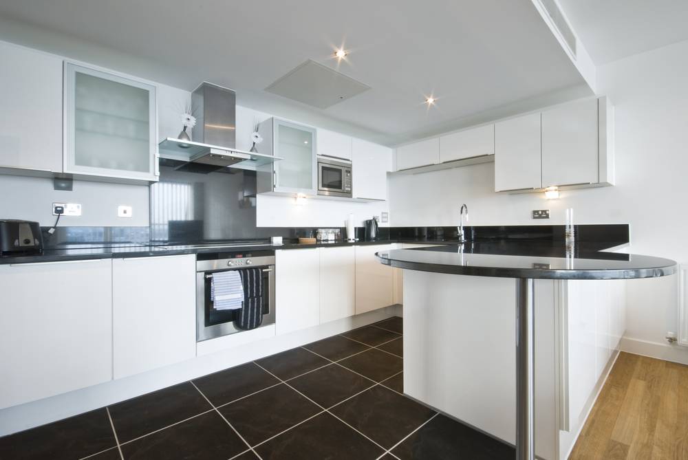 Такому стилю оформления присущи черты минималистического и скандинавского стилей. Таким образом, дизайн кухни простой и современный, в нем нет цветовых акцентов или замысловатых форм. Такой стиль в сочетании с высокими потолками придает кухне эффект простора. Небольшой стол с черным покрытием столешницы беспроигрышно выглядит среди белоснежной обстановки кухни, выполненной из пластика или дерева. Имея такой стол можно дополнить кухню хромированными деталями. Они будут не только отражать свет и делать помещение светлее, но и дополнят его образ.