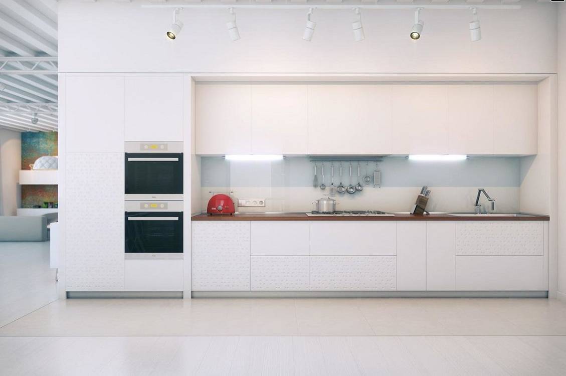 Чтобы не кухня не превратилась в операционную, добавьте помещению цветные акценты. С белым хорошо сочетаются панели, ламинат, кафельная плитка под дерево. Достаточно в светлый интерьер ввести знаковый плинтус для пола и соединения стола с кухонным фартуком.