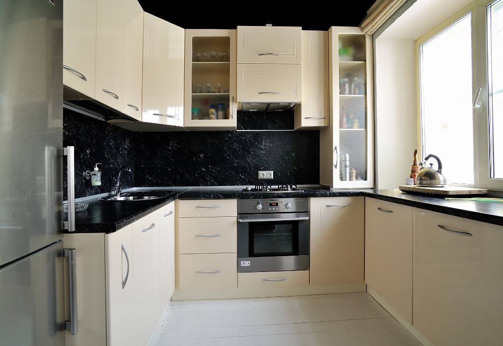 Оптимизировать пространство и создать дополнительную рабочую плоскость позволит столешница, объединяющая гарнитур и подоконник. Следует максимально продумать систему хранения, используя современные материалы и комплектующие. Например, под духовым шкафjм неплохим решением будет организовать выдвижной ящик для хранения сковородок и противней. Встраиваемая бытовая техника в данном случае лучше, чем отдельностоящая. Она гораздо компактнее и функциональнее. Приборы могут скрываться за фасадами кухни или быть на виду. Мойку можно установить в углу гарнитура, а тумбу под ней оснастить современными системами хранения вроде полки-карусели, «волшебного уголка» и т.д.