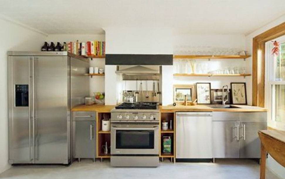Лучше всего, чтобы техника была, во-первых, по максимуму встроенная, а второе, уменьшенная и универсальная. Так, к примеру, сохранить пространство смогут помочь: машина для мытья посуды шириной 45 см, холодильник шириной 55 см, плита с 2-3 конфорками и духовка-микроволновка.