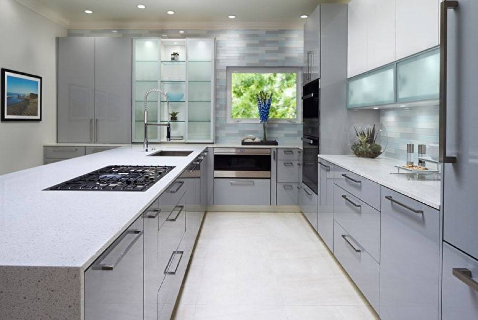 дверцы кухонного гарнитура могут иметь зеркальные вставки, или просто быть глянцевыми, что положительно повлияет на визуальное восприятие размеров комнаты;