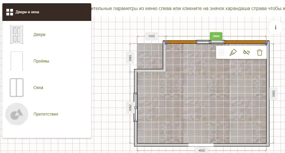 Вы можете менять не только расположение окон и дверей, а также изменять их размеры, нажав на карандаш.