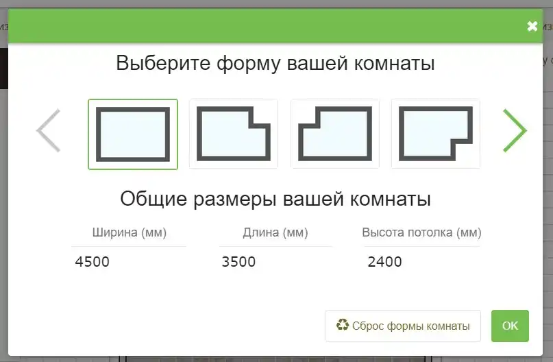 Если Вы все таки решили строить свою комнату, а не из готового решения, тогда после нажатия кнопки «Далее» конструктор попросит задать размеры комнаты. В проектировщике уже имеются наиболее популярные формы комнат, кликаете нужную и не забудьте установить свои размеры: ширину, длину и высоту потолков.