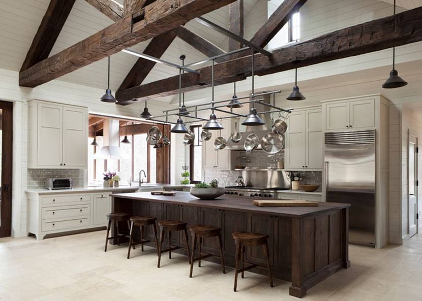 Наравне с современными купольными вытяжками и гигантскими холодильниками пространство наполняют детали с историей. Интерьер украшают старинные потолочные балки, медная посуда, оригинальные стулья.