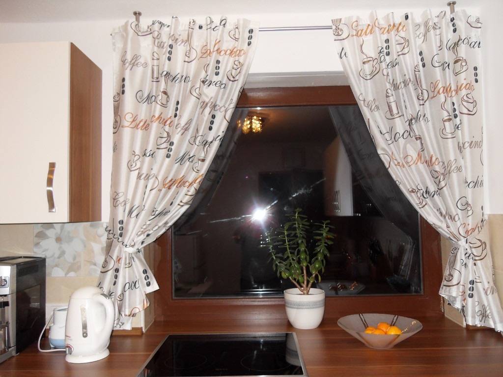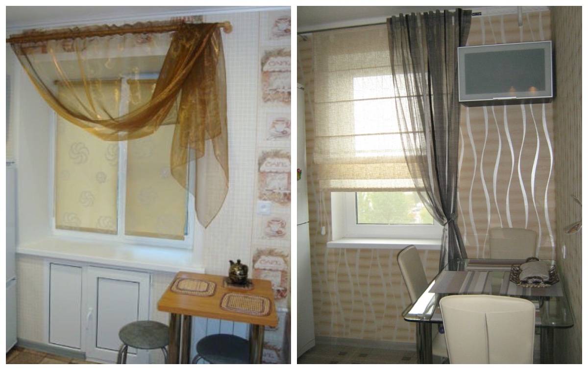 Короткие полупрозрачные занавески будут лучшим вариантом на малогабаритной кухне