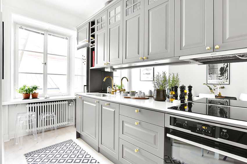 Светлые оттенки серого выгодно смотрятся в интерьере небольшой кухни, размер которой визуально расширяется.