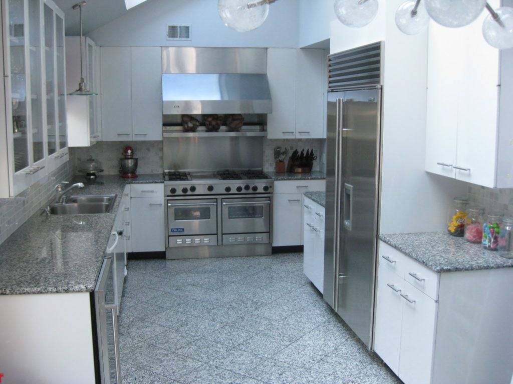 Часто в интерьере используют такие комбинации, белые стены и светло-серая мебель, а бытовая техника, посуда подбирается из нержавеющей стали.