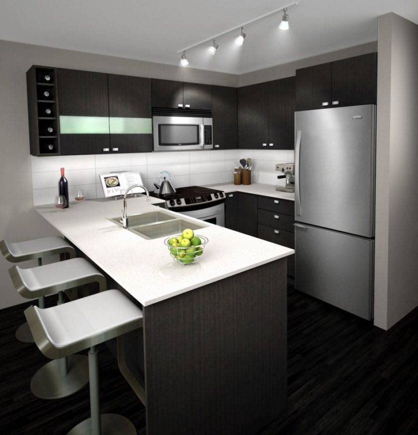К такому дизайну подбирают хромированную технику и сантехнику. Серебристый цвет ручек, плафонов, посуды подчеркнет благородство убранства. Хорошо выглядят фасады, где темный низ и светлый верх. Чтобы интерьер не казался слишком мрачным, выберите для настенной плитки и столешницы белый цвет .