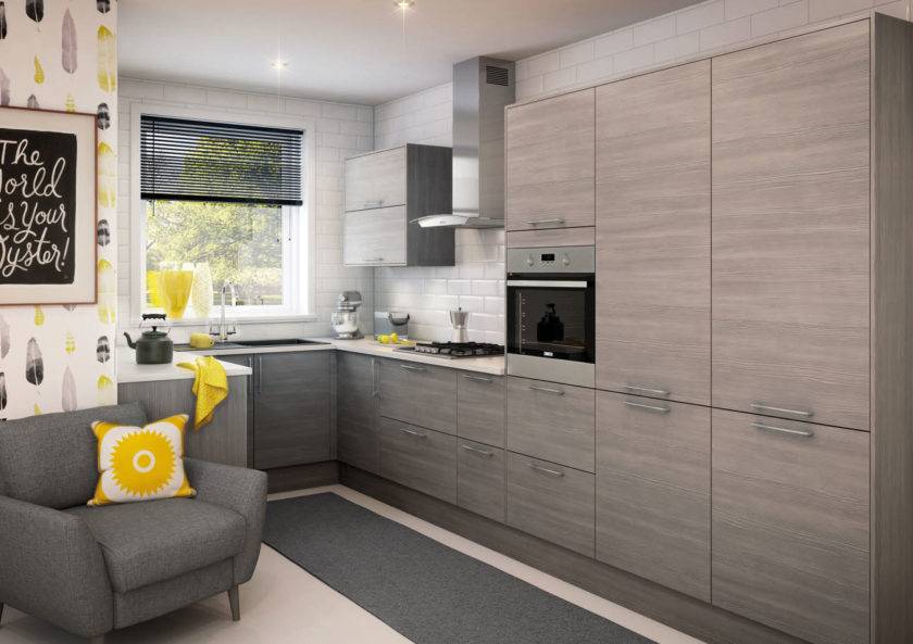 Серые фасады хорошо гармонируют со светлым деревом в гарнитуре. Кухня не будет смотреться безликой, если добавить деревянную кухонную мебель, столешницу из этого же материала, стол и стулья. Также красиво выглядит столешница из мрамора и камня.