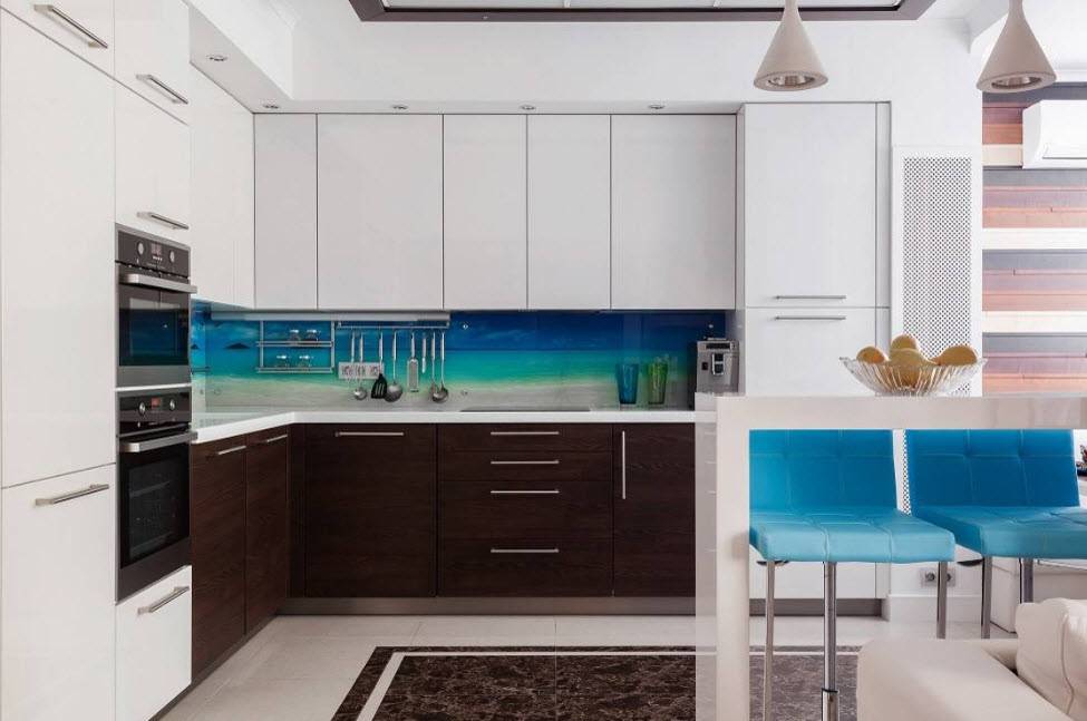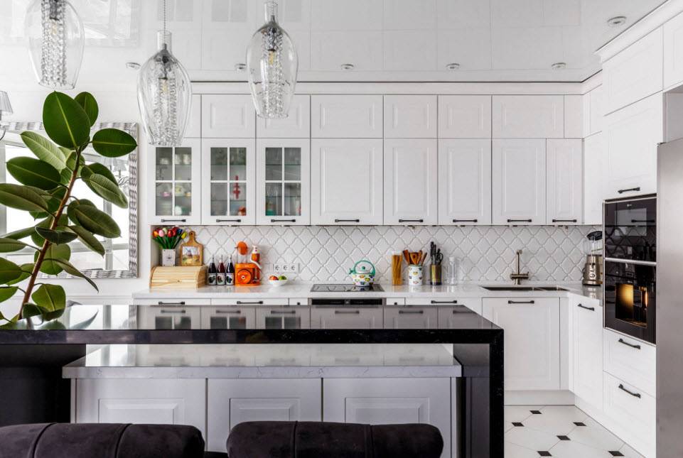 Поиграйте с цветами, сделав столешницу контрастного цвета или установив скинали с ярким принтом. Этими акцентами можно отлично разнообразить общий монохром помещения.