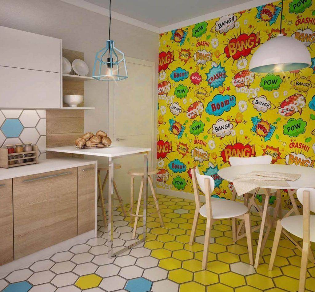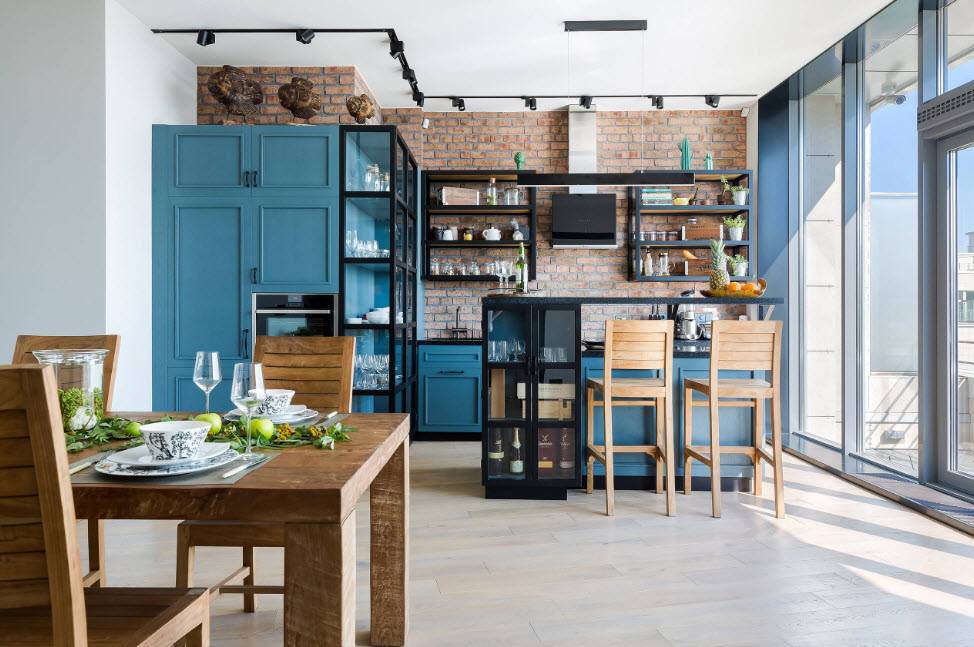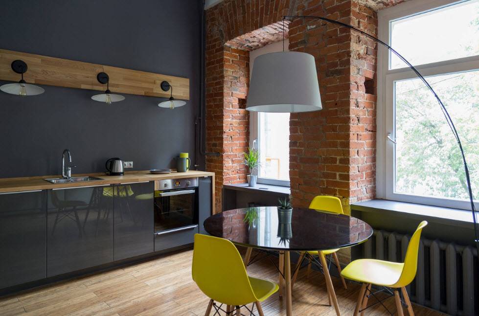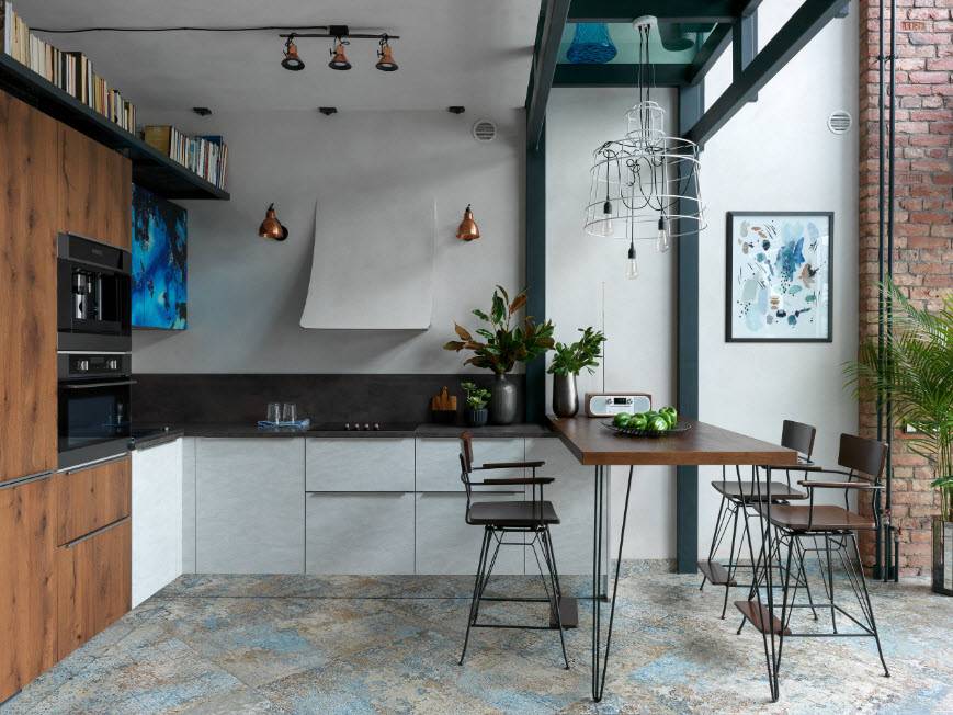 Современной кухне – современные материалы. Отделка любая: индустриальная кирпичная кладка лофта или обои – нужно лишь брать в расчет необходимость ухода (ровную поверхность проще протирать, нежели фактурную). Пол выложите плиткой, камнем или паркетной доской – все эти материалы ударопрочные, но в последнем случае в обязательном порядке должно быть влагоотталкивающее покрытие.