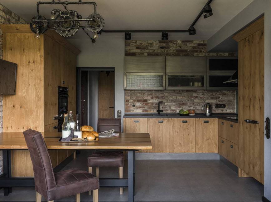 Брутализм является одним из спорных направлений современного дизайна. В нем могут гармонично уживаться такие материалы, как натяжное полотно и кирпич, камень и трубы, ковер и непокрытые стены. Стилистика считается противовесом буржуазному миру. В такой кухне каждый предмет должен нести функциональную нагрузку, будучи выполненным из качественного и долговечного материала. Ресурс стиля – бетон, древесина, металл, стекло.