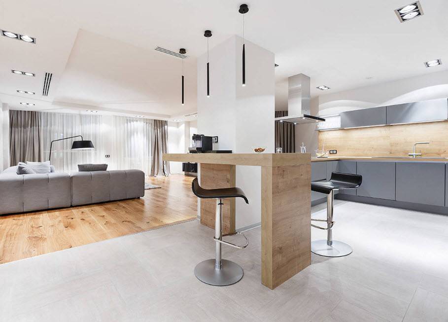 - Дизайн в светлых тонах с барной стойкой.
