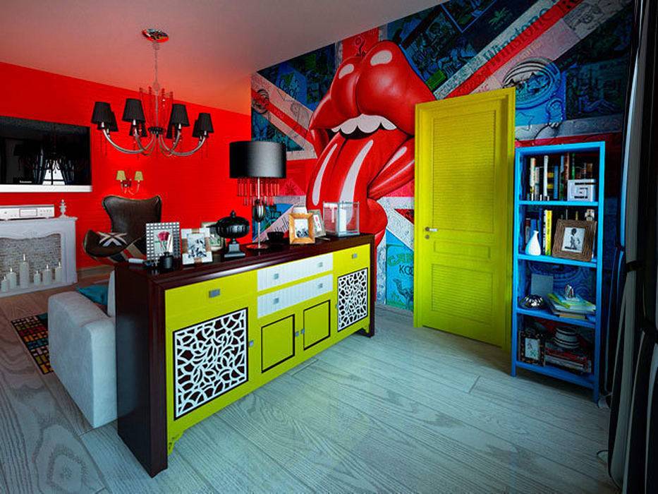 Украшения одинаково важны. Выбирайте сложные керамические предметы, предпочтительно те, что привезены из дальних путешествий, то есть цветочные горшки, вазы или статуэтки ручной работы. Оригинальные аксессуары в стиле китч также можно найти в популярных сетевых магазинах дизайна интерьера. Интересным решением для стен станут пестрые обои с причудливым рисунком.