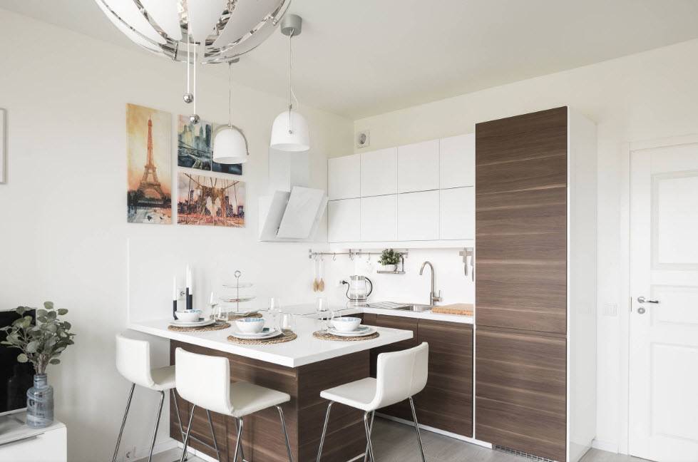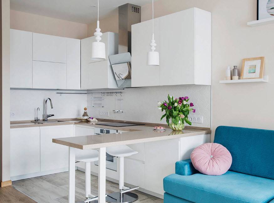- Интерьер светлой кухни с двухъярусной барной стойкой в квартире студийной планировки.